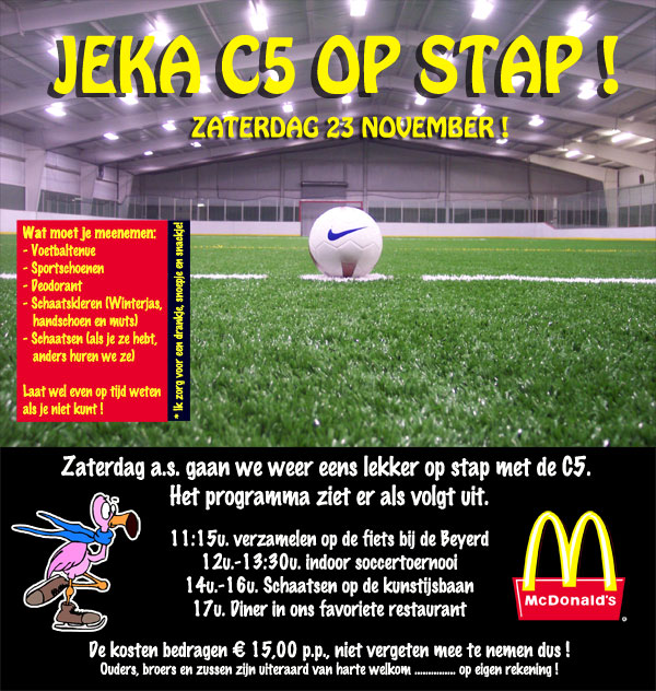 Zaterdag hebben we onze eerste competitiewedstrijd afgewerkt. 16-0 gewonnen van UVV D uh C2. Leuk voor de doelpuntenpot maar verder hebben we helemaal niets aan zo'n voorstelling. Tweede helft dus maar een fantasie-opstelling uit de hoge hoed getoverd. Joost in de spits en zo ook de rest gespiegeld op het veld gepositioneerd. Hopelijk zaterdag a.s. beterschap en wat meer tegenstand. Hup C5! Comming up: BOEIMEER C4 - JEKA C5Aanvang: 11:45u., Aanwezig: 11:15u. (ook voor de laatkomers). Groet Orson |